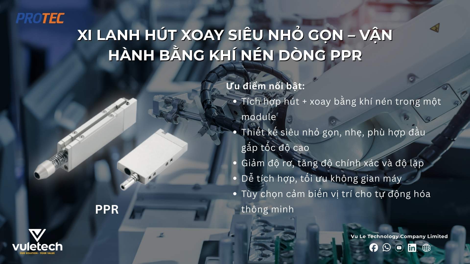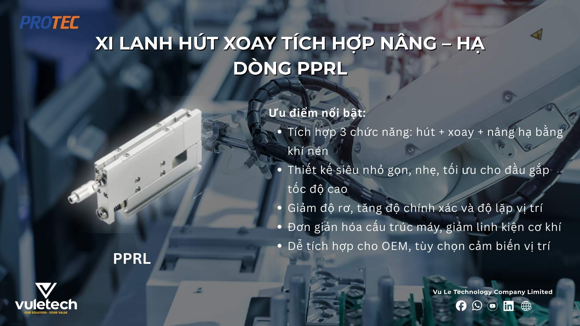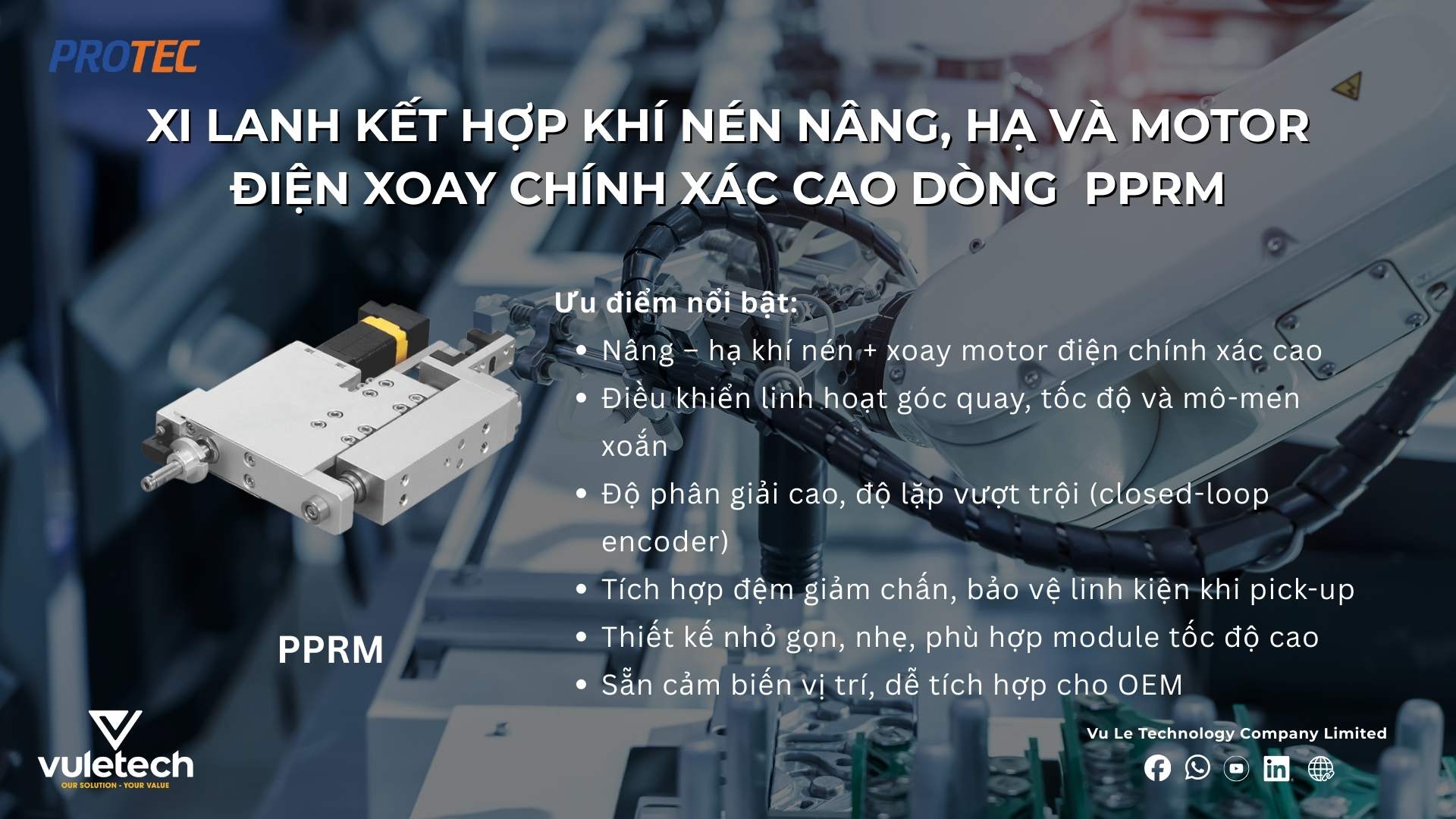Để đáp ứng các mức yêu cầu khác nhau của OEM, PROTEC (Hàn Quốc) đã phát triển ba dòng xi lanh hút xoay tích hợp gồm PPR – PPRL – PPRM, từ giải pháp khí nén nhỏ gọn tiêu chuẩn đến phiên bản điều khiển điện chính xác cao.