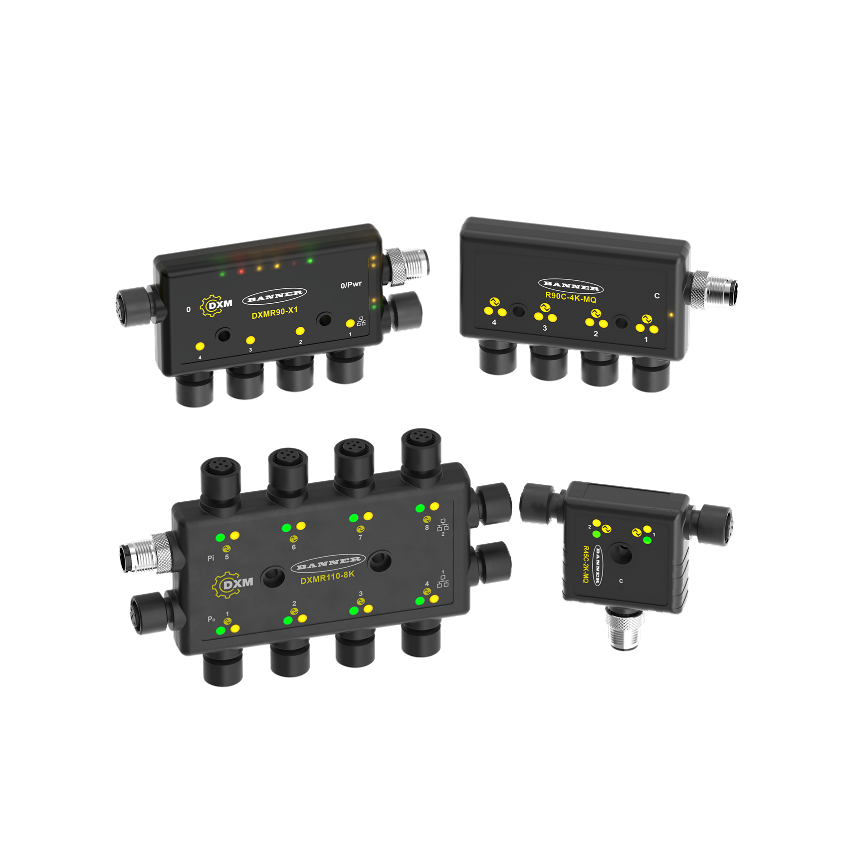 IO-Link Masters enable users to collect more real-time data from a greater number of devices. IO-Link Masters are available in three different configurations: two-port (R45), four-port (R90), or eight-port (R110) models. They each serve as a gateway for connecting IO-Link devices to control systems on the market. The IO-Link Masters transmit machine data, process parameters, and diagnostic information via either Modbus RTU, Ethernet IP or Modbus TCP (model dependent) This configuration makes it possible to send IO-Link data to PLCs, HMIs, SCADAs, and cloud platforms.
