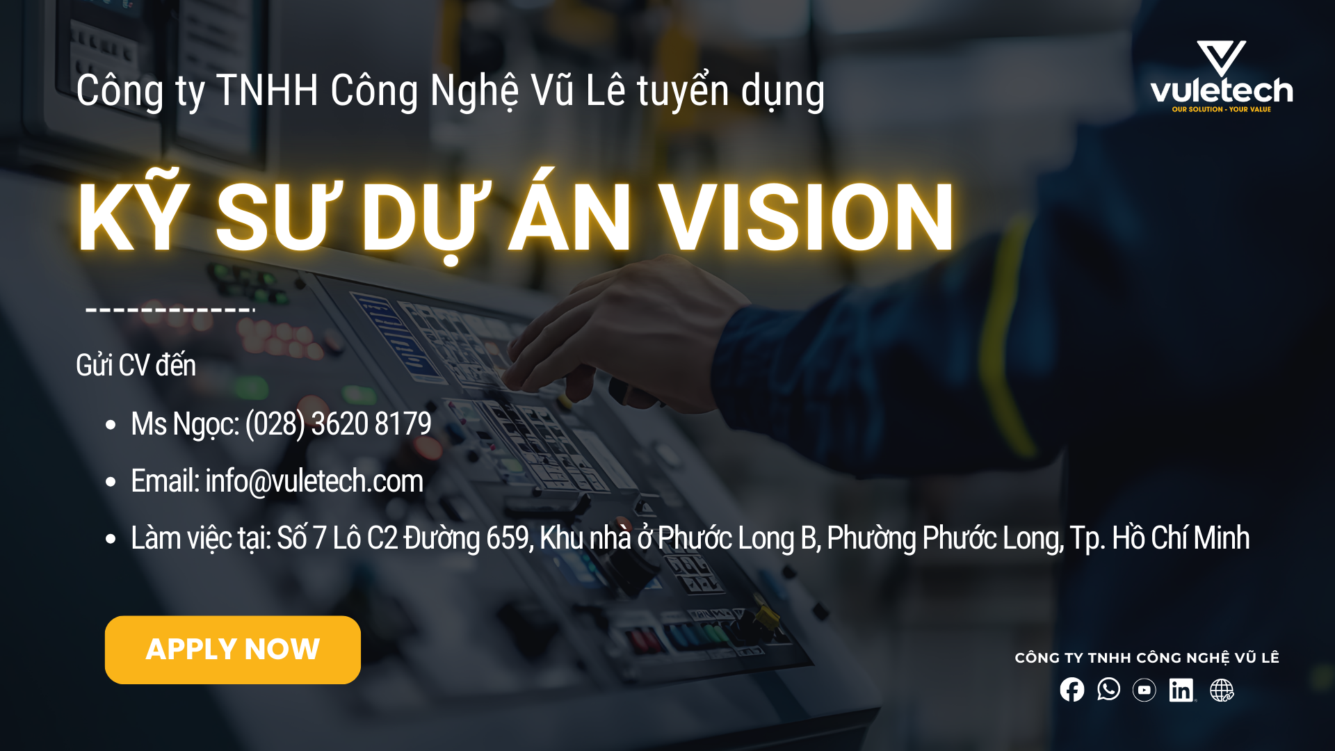 Ứng tuyển vị trí + Họ và tên và gửi về email: admin@vuletech.com - Nộp trực tiếp tại: Văn phòng TP.HCM – Công ty TNHH Công Nghệ Vũ Lê